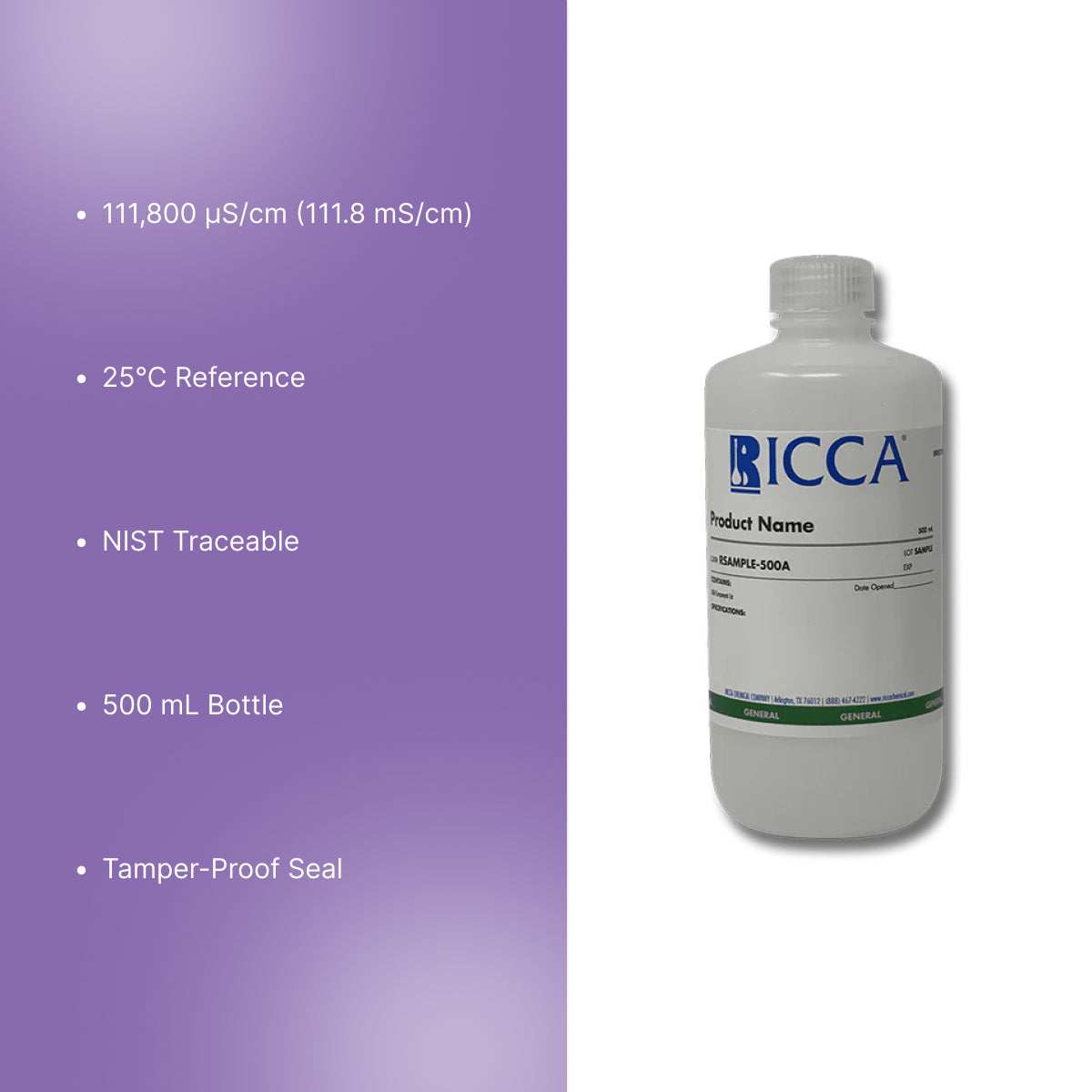 - Key Performance Benefit: Potassium Chloride Conductivity Standard, 111,800 µS/cm (111.8 mS/cm) at 25°C is a premium quality conductivity solution designed for analytical use. Standardized with a conductivity meter calibrated using potassium chloride NIST 2202 SRM in deionized water in accordance with ISO 3696/BS3978.