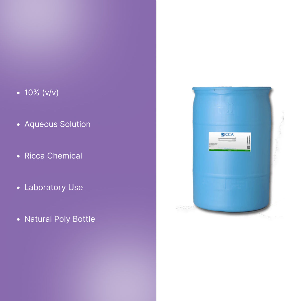 This phosphoric acid solution from Ricca Chemical is a 10% (v/v) aqueous formulation supplied in a natural poly bottle. It is intended for laboratory use and is offered in multiple container sizes.Chemical identifiers include CAS 7732-18-5 and 7664-38-2. The molecular weight is 79.979 g/mol and the molecular formula is HO₃P. Safety Data Sheet information notes hazards including severe skin burns, eye damage, and corrosive properties.