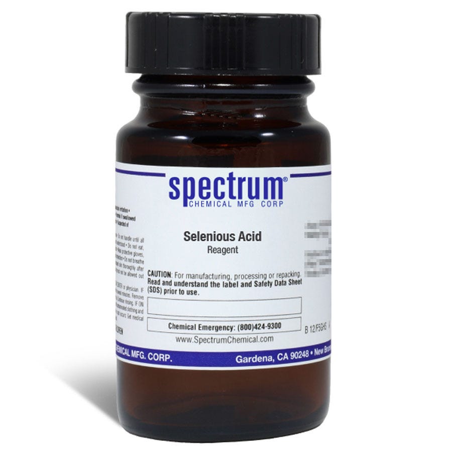 Selenious Acid, Reagent is a chemical compound used in changing the color of steel and nitric acid. The Reagent grade denotes that this chemical is the highest quality commercially available and that the American Chemical Society has not officially set any specifications for this material. Spectrum Chemical manufactured Reagent grade products meet the toughest regulatory standards for quality and purity.