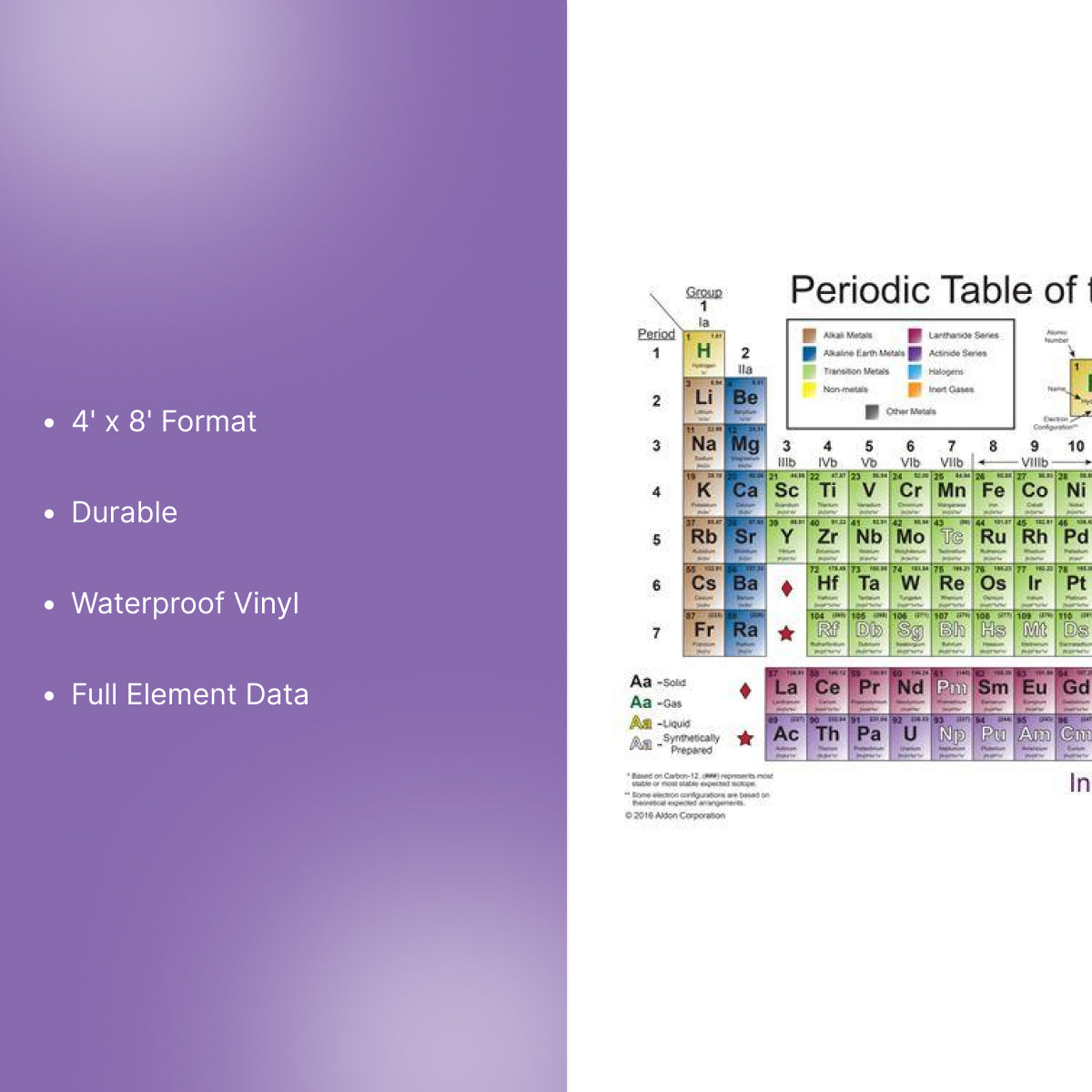 The Aldon Periodic Table Vinyl 4' x 8' (SKU: IS2942) is a durable and large-format educational tool designed for classrooms and labs. The 4' x 8' size ensures easy visibility for all students, even from the back of the room. Printed on waterproof vinyl, this poster is built to withstand long-term use, making it perfect for both educational environments and scientific settings. The poster features a full list of elements, including their names, symbols, atomic numbers, weights, masses, and electron configurations. The color-coded families help students easily distinguish between metals, non-metals, and noble gases.