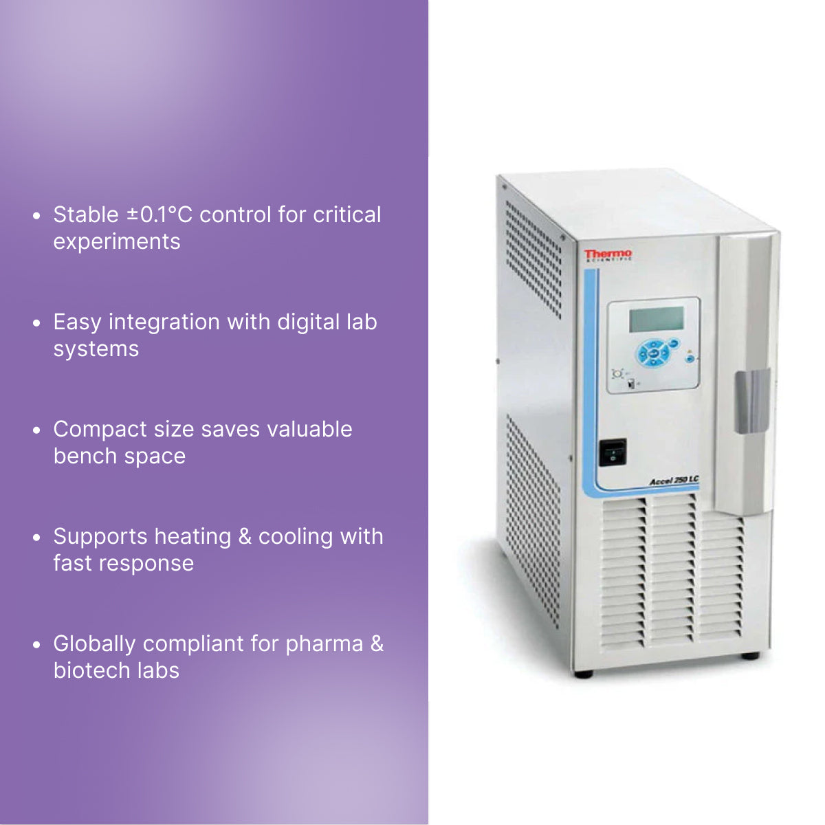 The Thermo Scientific Polar Series Accel 500 LC Recirculating Chiller delivers 500 watts of powerful heating and cooling performance, designed for precise temperature control in demanding laboratory workflows. With a temperature range of -10°C to +80°C, this compact yet versatile unit supports a wide variety of research and production applications.
