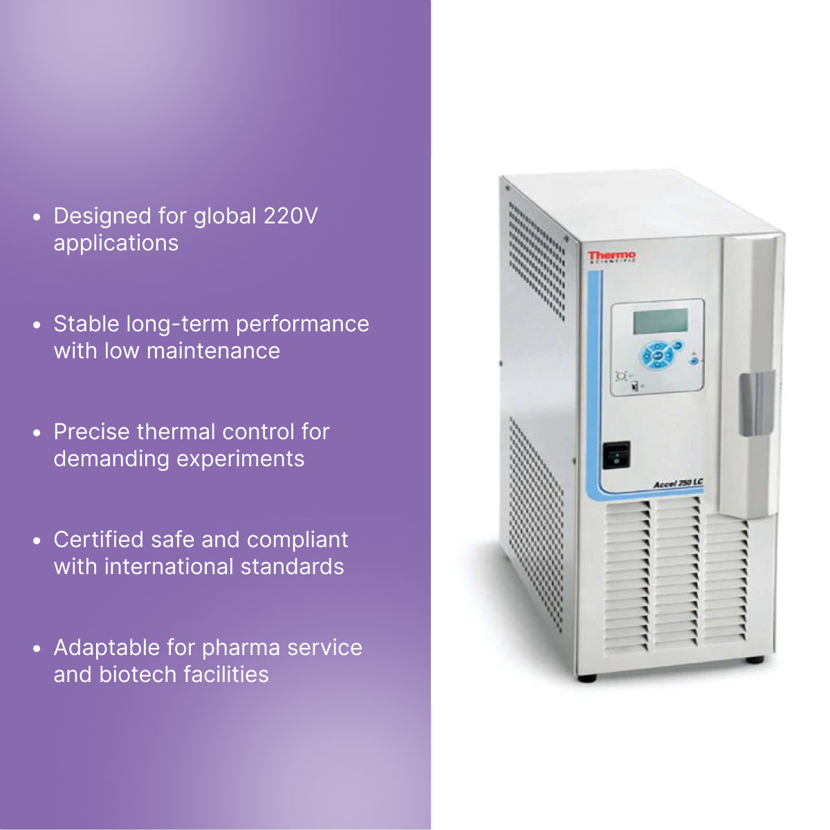 The Thermo Scientific Polar Series Accel 500 LC Recirculating Chiller (220V/60Hz) is designed to meet the demands of international laboratories and production sites that rely on high-voltage systems. Delivering 500W of cooling capacity and stable heating up to +80°C, this unit ensures dependable operation across a wide range of scientific and industrial applications.