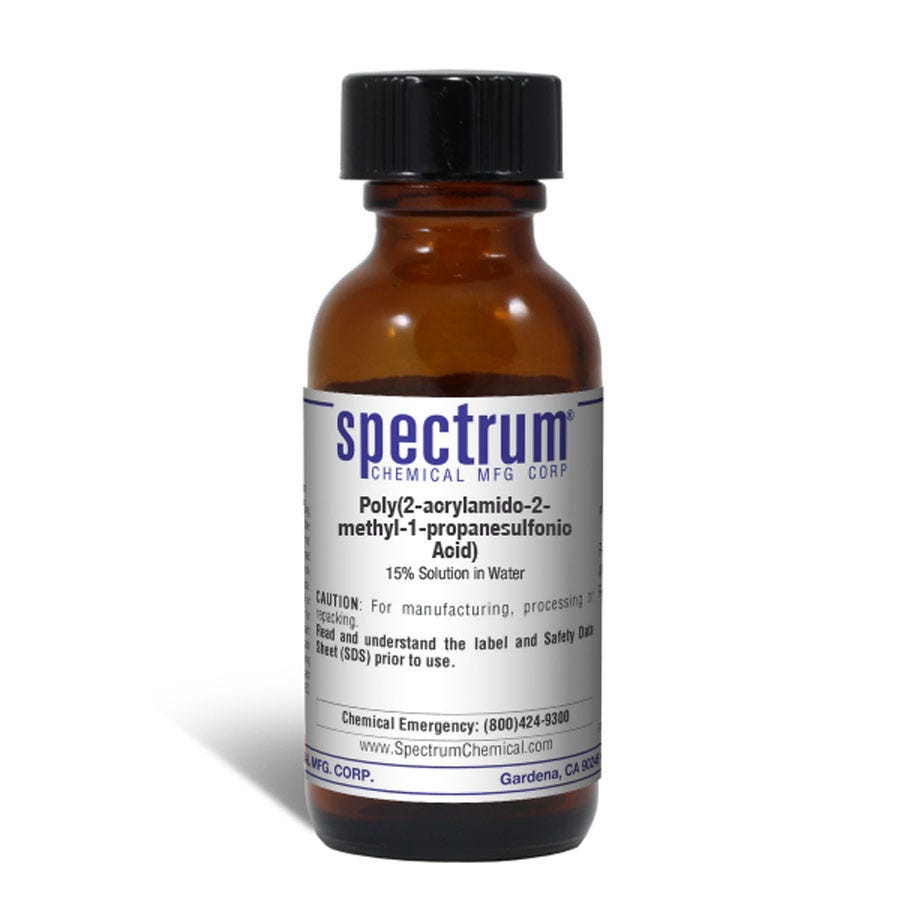 Poly(2-acrylamido-2-methyl-1-propanesulfonic Acid), 15 Percent Solution in Water is used as a thickening agent for acidic or basic cleaning agents, friction reducing agent, water-based lubricant, mineral scale remover and suspension aid for pigments and fillers. It is also a rheology control agent in water and some organic solvents. Ungraded products supplied by Spectrum are indicative of a grade suitable for general industrial use or research purposes and typically are not suitable for human consumption or therapeutic use.