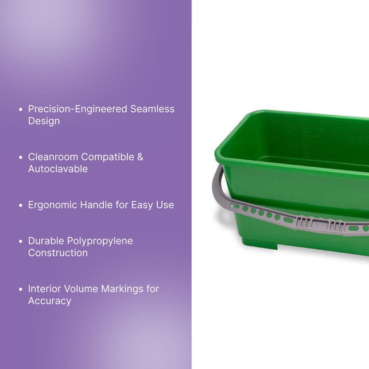 The Texwipe AlphaMop® Polypropylene Rectangular Bucket is designed to meet the stringent requirements of cleanroom environments. Made from high-quality polypropylene, this 6-gallon (22-liter) bucket features a seamless design that reduces contamination risks, making it ideal for pharmaceutical, biotech, and semiconductor cleanrooms.