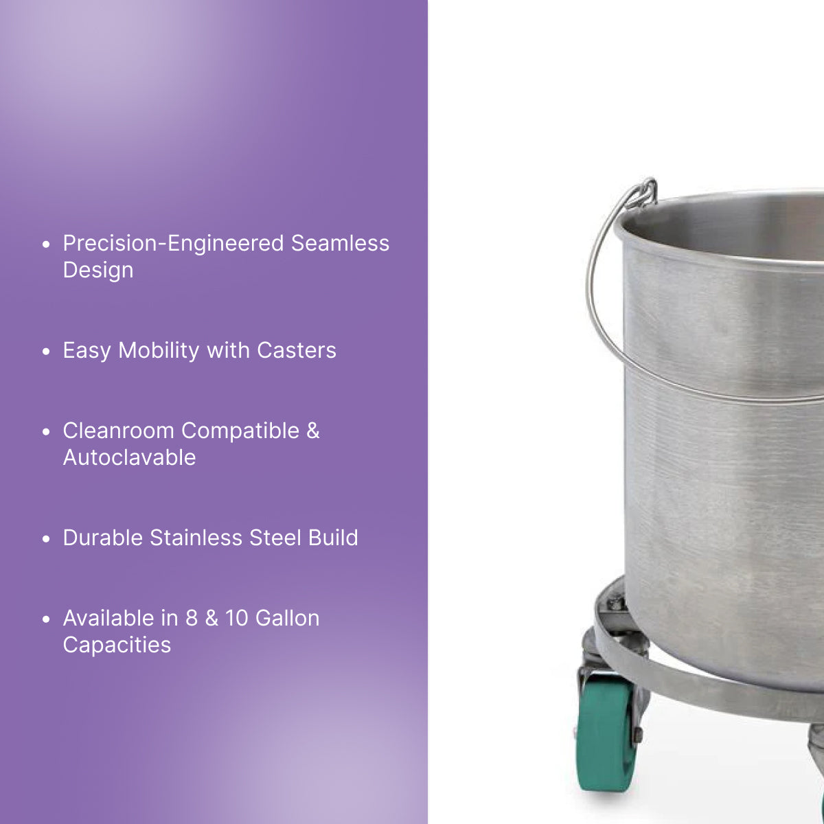 Available in 8-gallon (30 L) and 10-gallon (37 L) capacities, these stainless steel buckets are compatible with BetaMop® systems and cleanroom wipers, supporting effective use of both cellulose wet wipes and polyester cleanroom wipes. They are autoclave-safe, ensuring sterile cleaning and maintenance of contamination-free environments.