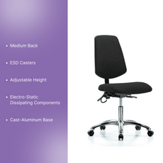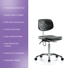 Polyurethane ESD Desk Height Chair in Chrome is adjustable from 17.5-22.75 inches from the top of the seat to the floor and features ergonomic adjustments including seat height and locking back tilt, electro-static dissipating components to ensure proper grounding, and cast-aluminum base with dual-wheel, self-braking, non-marring ESD casters suitable for hard floors in electro-static dissipating polyurethane.