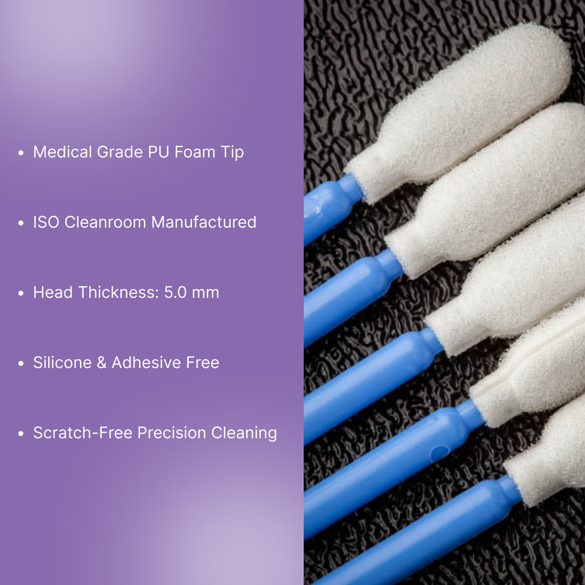 - Material & Construction: The swabs are crafted through an automated fabrication and inspection process that eliminates defects common in traditional swabs, offering a clean, scratch-free application. The swab tip is constructed from medical-grade open-cell PU foam.