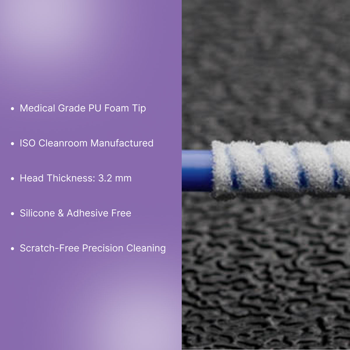 • Material & Construction: The swabs are crafted through an automated fabrication and inspection process that eliminates defects common in traditional swabs, offering a clean, scratch-free application. The swab tip is constructed from medical-grade open-cell PU foam.