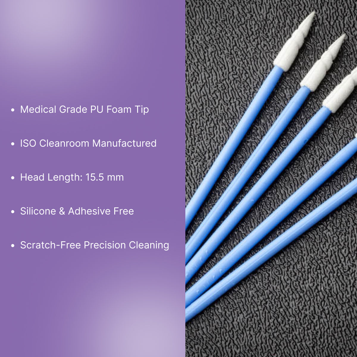 • Material & Construction: The swabs are crafted through an automated fabrication and inspection process that eliminates defects common in traditional swabs, offering a clean, scratch-free application. The swab tip is constructed from medical-grade open-cell PU foam.