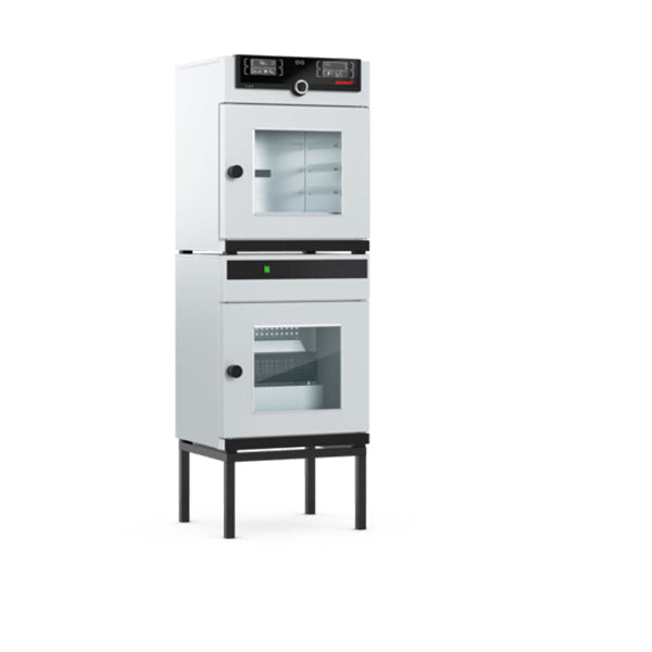 Digital pressure control ensures rapid and gentle vacuum drying. The speed-controlled vacuum pump (accessory) saves around 70% energy. The direct contact between the load and the heatable and removable thermoshelves in the chamber of the Memmert vacuum oven VO49 ensures rapid and uniform temperature control of food, cosmetics, watches, books, PCBs or injection molds, without the loss of heat. Two connections for thermoshelves are in the rear (1st and 3rd level). The net weight is approximately 83 kg.