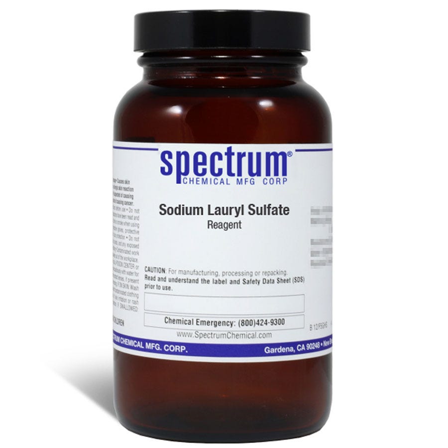 Sodium Lauryl Sulfate, Reagent, is an organic compound, and anionic surfactant derived from coconut or palm oils, for use as a detergent. As an Organosulfate, this salt has the amphiphilic properties needed in a detergent. It's uses vary from shark repellent, fruit fly killer and biocide. Its reagent grade means this is the highest quality commercially available for this chemical and that the American Chemical Society has not officially set any specifications for this material.