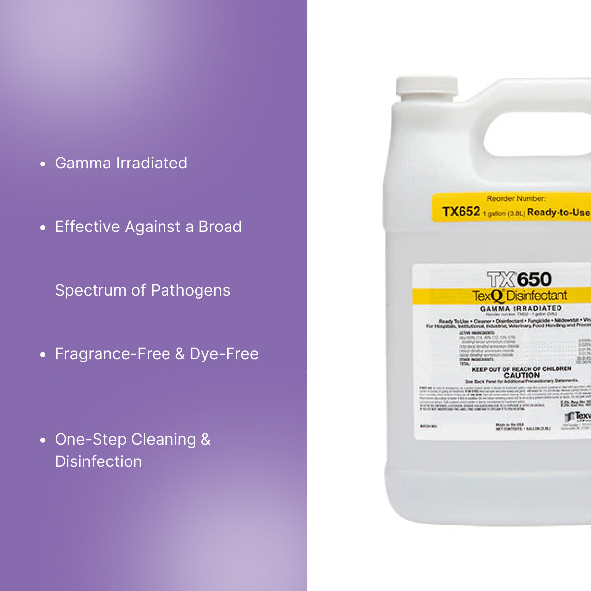 TexQ® Disinfectant is an EPA-registered, one-step disinfectant and cleaner that effectively combats a wide spectrum of bacteria, viruses, and fungi. This disinfectant is formulated to be fragrance-free, dye-free, and is 0.2 micron filtered, making it ideal for cleanroom environments. It is gamma irradiated and sterile validated following AAMI guidelines, ensuring compliance with aseptic environment requirements and USP <797>.