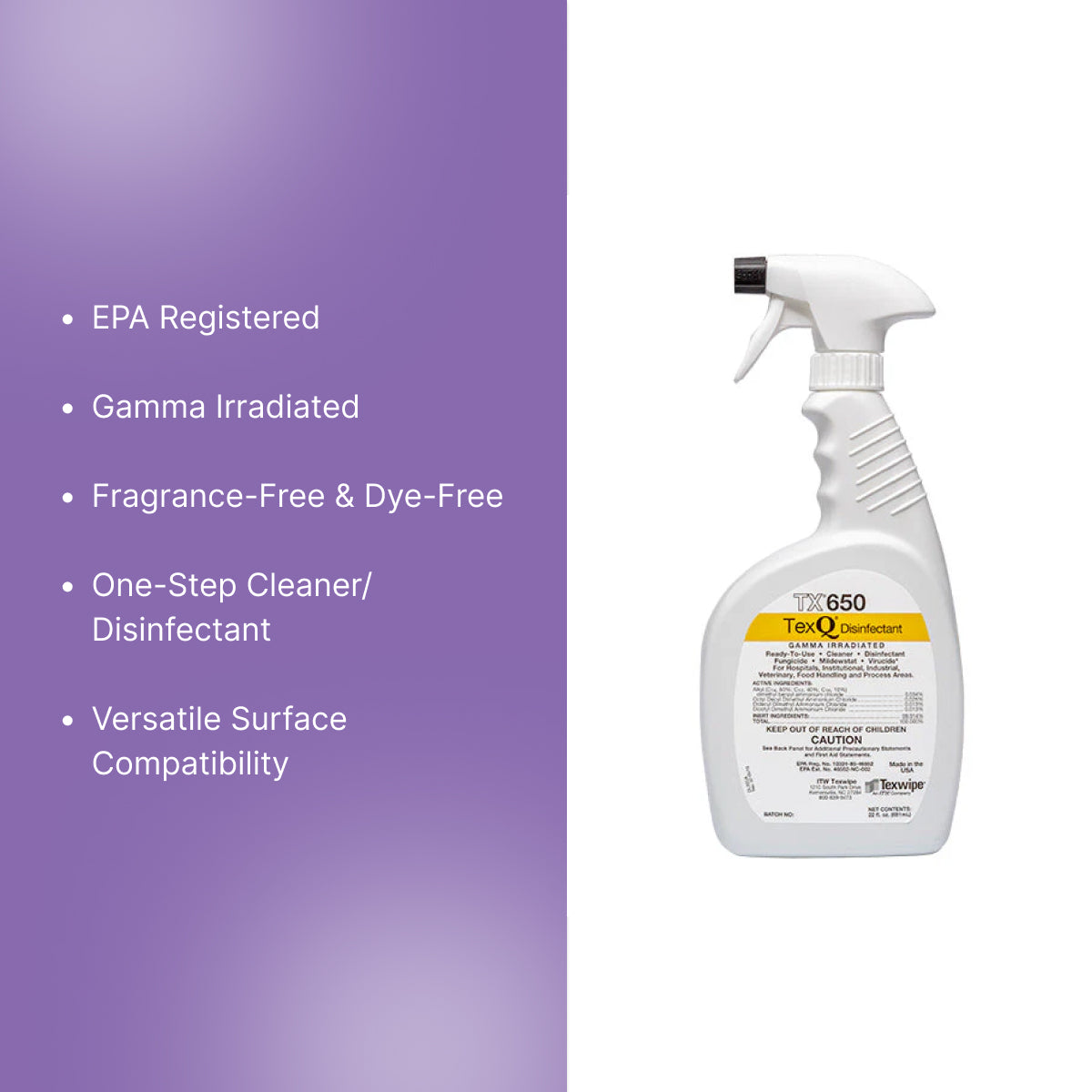 TexQ® Disinfectant is an EPA-registered, ready-to-use disinfectant and cleaner, designed for effective and safe cleaning in cleanroom environments. This gamma-irradiated formula is validated for sterile environments according to AAMI guidelines, providing 54 kill claims against a broad spectrum of bacteria, viruses, and fungi. Additionally, it inhibits mold, mildew growth, and odors when used as directed.