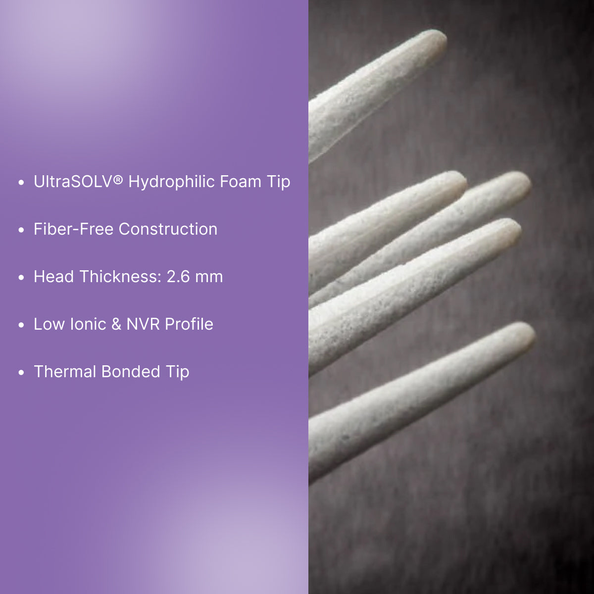 • Material & Construction: The swabs feature a hydrophilic UltraSOLV® foam tip and a fiber-free design that prevents fiber shedding and contamination. The tips are thermally bonded to the handle, eliminating adhesive residue.