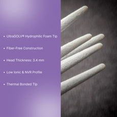 All foam swabs are manufactured with 100 pores per inch reticulated polyurethane foam, which ensures excellent absorbency while minimizing contamination. Tips are affixed by heat seal to prevent tip loss, even while saturated with solvent. Flexible tips provide versatility and softer touch, while rigid heads allow for more aggressive cleaning. 2306 swab is Techspray's most popular foam swab. Good for general purpose coating and cleaning.