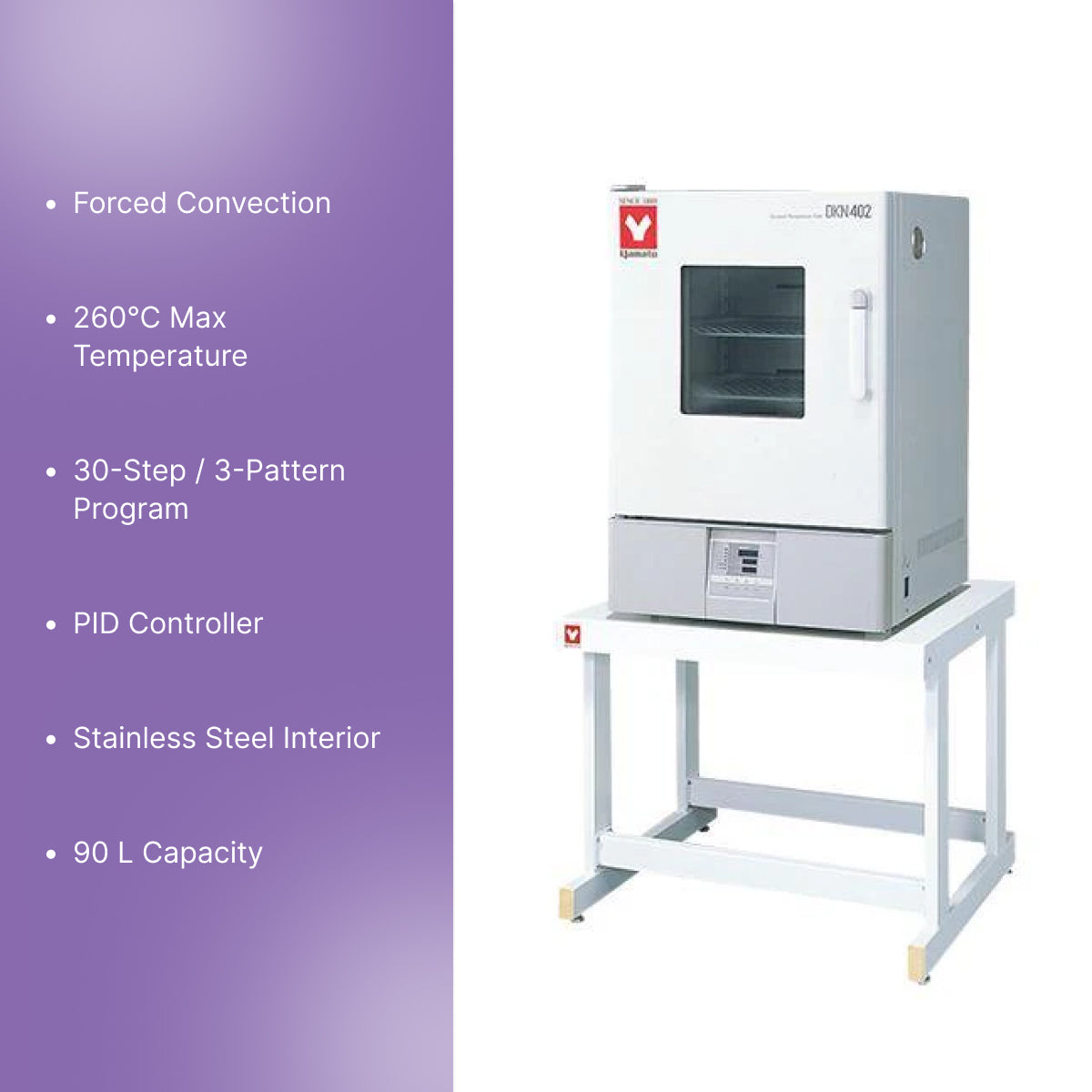 The Yamato DKN-402C is a programmable forced convection oven designed for precise temperature-controlled processing. It offers an operating range from room temperature +10°C to 260°C and uses a PID controller with 30-step, 3-pattern programmable modes.This oven includes self-diagnostic functions such as sensor abnormality detection, heater disconnection, and SSR-short protection. Additional features include overheat prevention, key lock, and built-in exhaust ports.