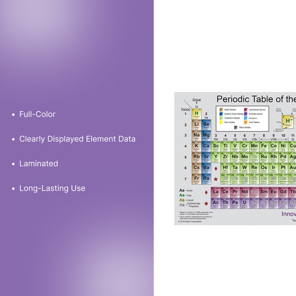 • Full-Color Printing: Vibrant and easy-to-read colors help differentiate between metals, non-metals, and noble gases.