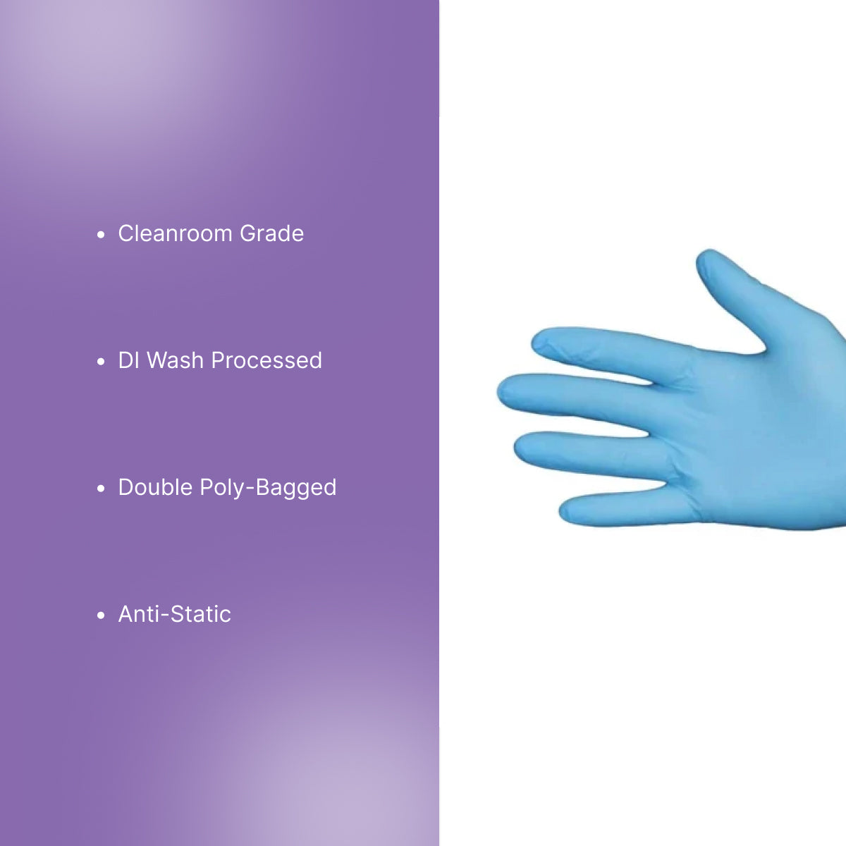 • Key Performance Benefit: Blue Cleanroom Nitrile Gloves are manufactured to provide the lowest levels of particulates and extractables possible. Inherently anti-static, they are ideal for use in Electronics, Semi-Conductor Industries, and Biotechnical Laboratories.