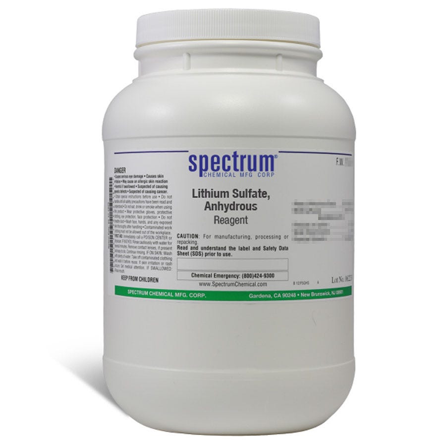 Lithium Sulfate, Anhydrous, Reagent, also known as Lithium sulphate, is used primarily to treat bipolar disorder. The Reagent grade denotes that this chemical is the highest quality commercially available and that the American Chemical Society has not officially set any specifications for this material. Spectrum Chemical manufactured Reagent grade products meet the toughest regulatory standards for quality and purity.