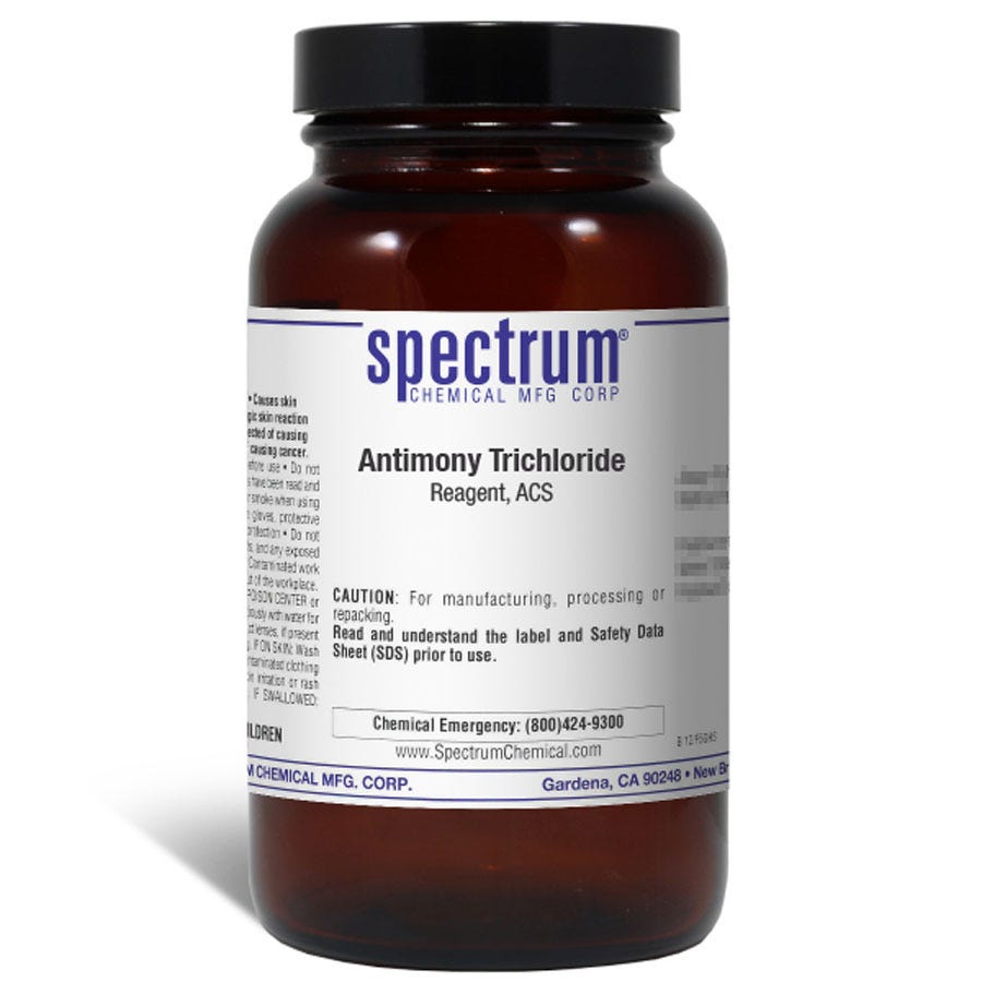 Antimony Trichloride, Reagent, ACS, also known as Butter of antimony or Antimonous chloride, is used as a reagent for detecting vitamin A and other carotenoids in the Carr-Price test. As an ACS grade quality reagent, its chemical specifications are the de facto standards for chemicals used in many high-purity applications and typically designate the highest quality chemical available for laboratory use. Spectrum Chemical manufactured Reagent ACS grade products meet the toughest regulatory standards for quality and purity.