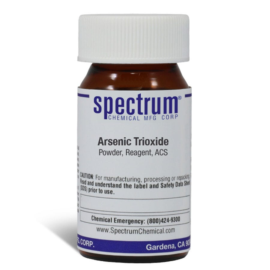 Arsenic Trioxide, Powder, Reagent, ACS is an inorganic compound that is also an amphoteric oxide and can be dissolved in solutions that are alkaline to give arsenites. It main uses are in the colorless glass making industry. It is also commonly found in traditional Chinese medicine. As an ACS grade reagent, Spectrum Chemical manufactured compound is used as the quality standard against which other substances are grade and has met the toughest regulatory standards for quality and pureness.