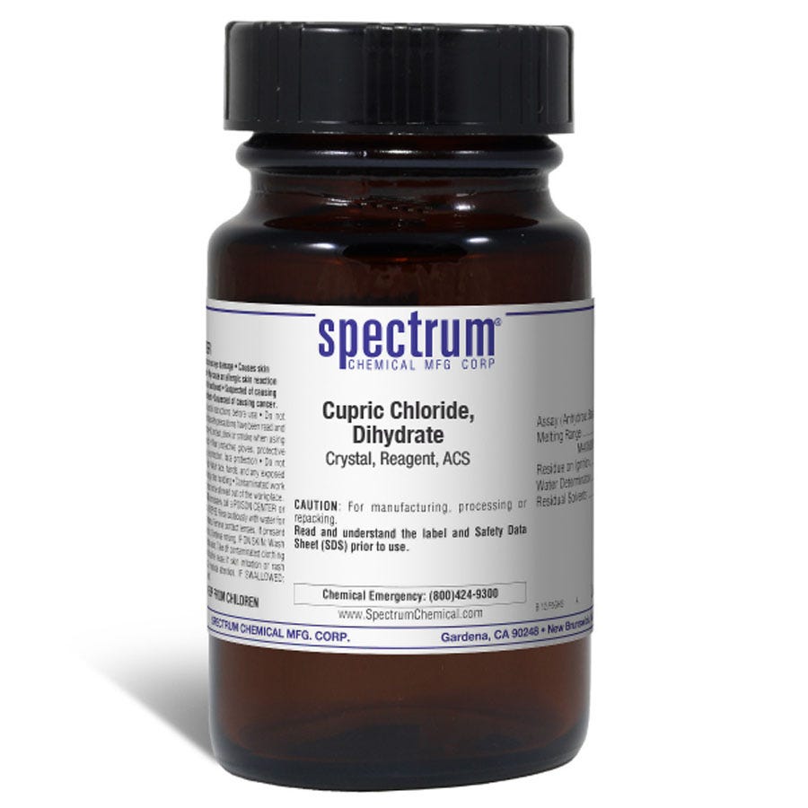 Cupric Chloride, Dihydrate, Crystal, Reagent, ACS is also known as copper chloride. It is a chemical compound with a blue green color. Copper (II) chloride is used as a synthetic catalyst, a pyrotechnic coloring agent and in humidity indicator cards. The Reagent grade denotes that this chemical is the highest quality commercially available and that the American Chemical Society has not officially set any specifications for this material. Spectrum Chemical manufactured Reagent grade products meet the toughest regulatory standards for quality and purity.