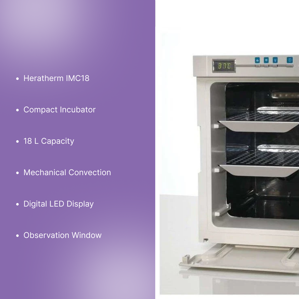 - Compact 18 L Chamber Capacity: Offers a space-efficient incubator with ample capacity for smaller laboratory workflows.