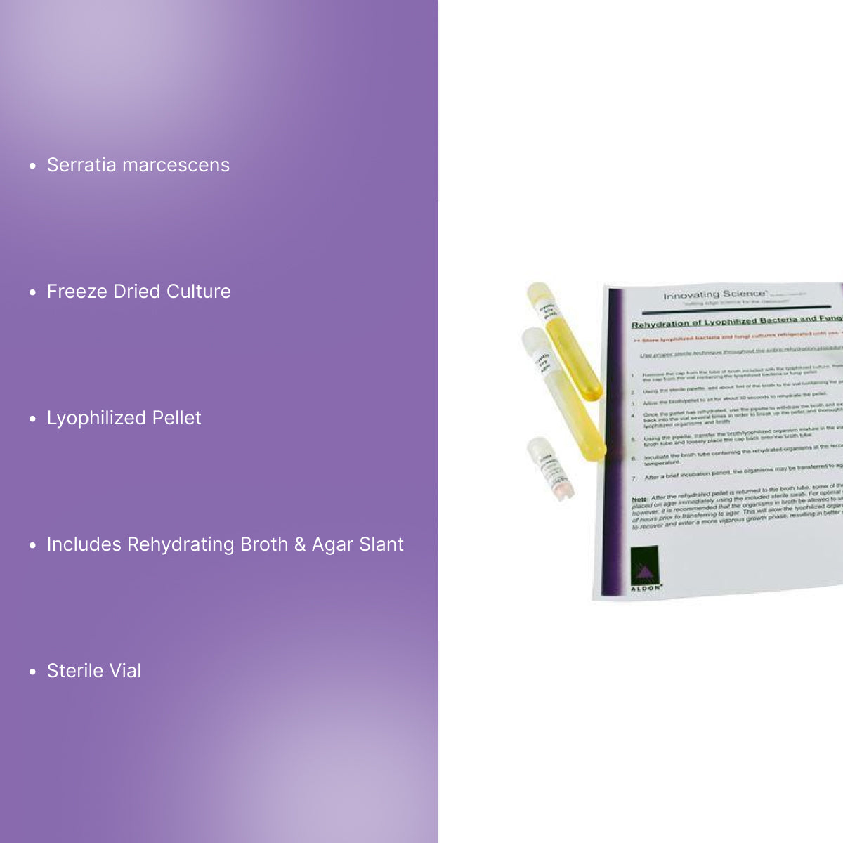 - Key Performance Benefit: Serratia marcescens culture supplied as a freeze dried, lyophilized pellet for rehydration and use.