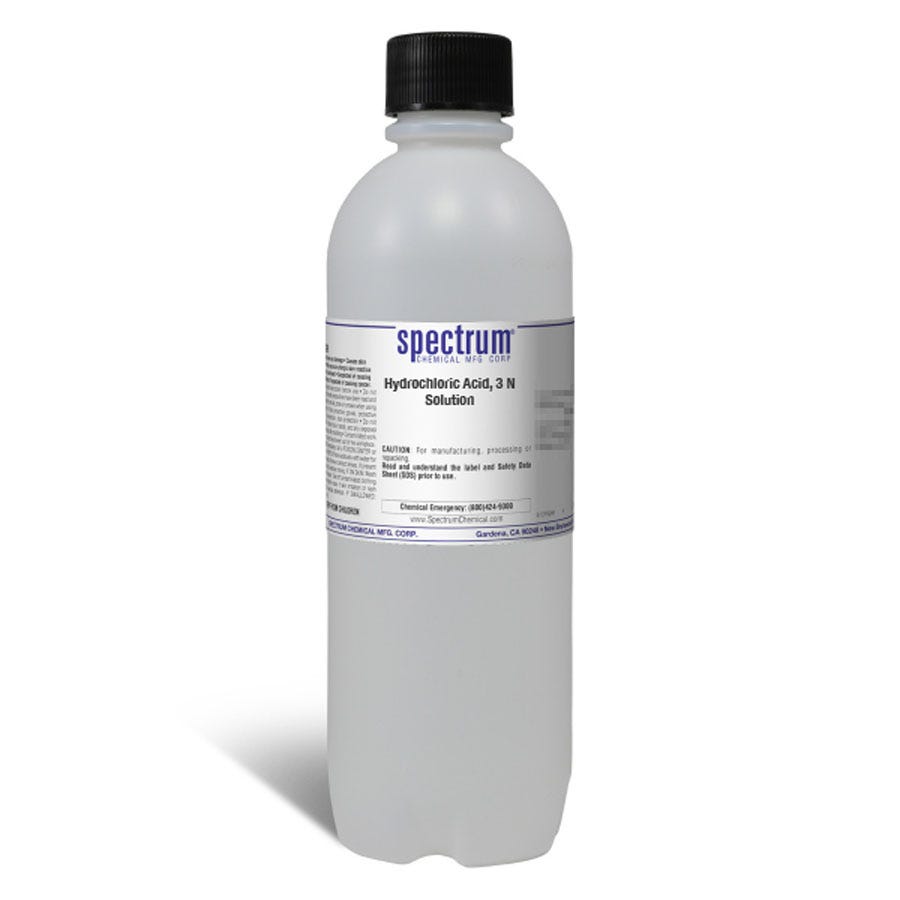 Hydrochloric Acid, 3 N Solution is a colorless, clear, highly corrosive, highly pungent solution of hydrogen chloride in water. As an monoprotic acid and one of the six common strong mineral acids it is the least likely to be subject to an oxidation-reduction reaction. Hydrochloric acid is frequently used during chemical analysis to prepare samples for analysis. It reacts with basic compounds, turning them into dissolved chlorides that can then undergo analysis.
