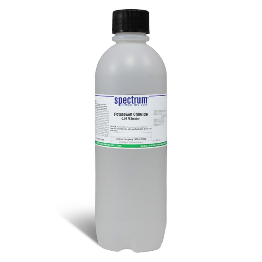 Potassium Chloride, 0.01 N Solution, For Conductivity, APHA - As an APHA certified solution, this item meets the ASTM D1209 standards for use in water and waste water treatment facilities to determine the concentration of dissolved and particulate materials. Spectrum Chemical manufactured APHA grade products meet the toughest regulatory standards for quality and purity.