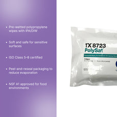 Texwipe PolySat 6" x 11" pre-wetted with 70% IPA. Peel-n-reseal packaging, 1800 wipers/Cs - TX8723