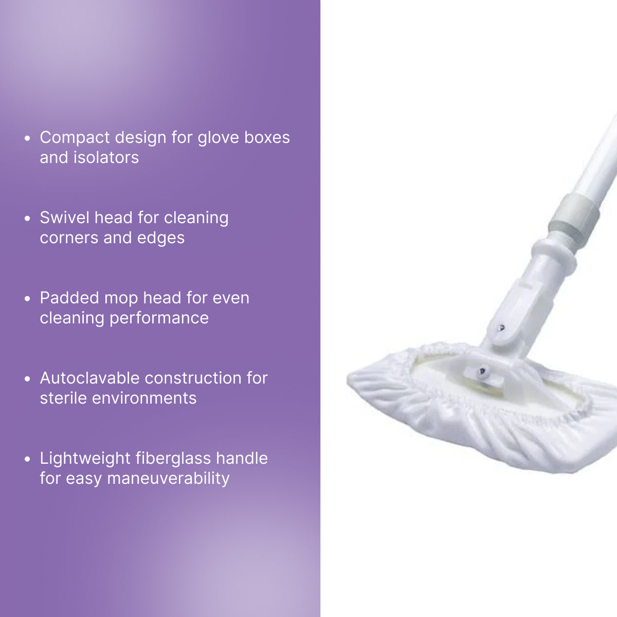 The Texwipe Mini AlphaMop TX7101 is designed for effective cleaning of isolators, glove boxes, biosafety cabinets, laminar flow hoods, and other confined spaces. Its lightweight fiberglass handle and low-profile swivel head allow one-hand operation while reaching tight corners without compromising cleaning performance. The padded mop head provides consistent coverage, and rounded edges protect sensitive surfaces from scratches.