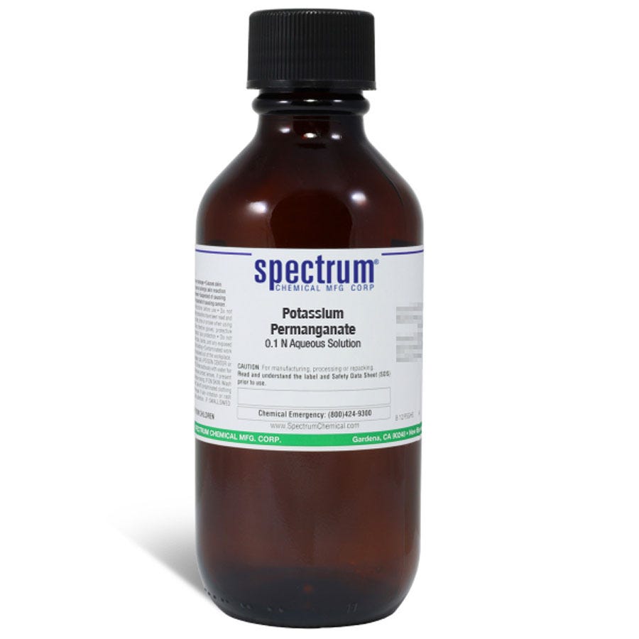 Potassium Permanganate, 0.1 N Aqueous Solution - Spectrum solutions utilize the highest quality raw materials appropriate to your product. Most raw materials meet or exceed the specifications established by the American Chemical Society. Where appropriate, many finished products are traceable to NIST Standard Reference Materials. Manufacturing, quality control testing, and packaging are all performed in Spectrum’s own facilities. Record keeping and sample retention of all produced lots ensure product consistency and complete traceability.