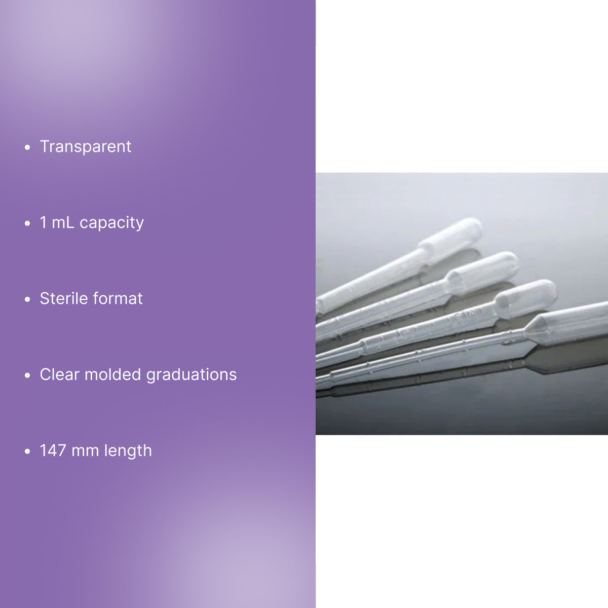 The 1 mL Pasteur Pipette – 500/pk, 2000/cs (SKU: 318012) is a sterile, individually wrapped transfer pipette designed for general laboratory liquid handling. Made from transparent medical-grade LDPE, this pipette provides clear visibility and consistent drop formation. The molded graduations support easy volume estimation, and the long 147 mm design offers comfortable reach for a variety of lab vessels. Supplied in bulk packaging of 500 per pack and 2000 per case, it supports high-volume laboratory workflows.