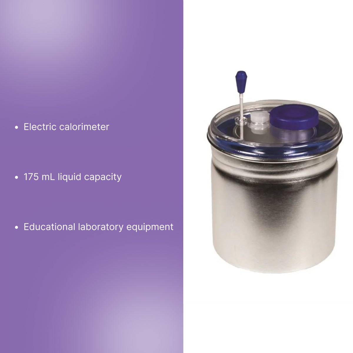 Material & construction: The calorimeter is constructed from aluminum and plastic and includes an inner container designed to hold liquid during calorimetry experiments.