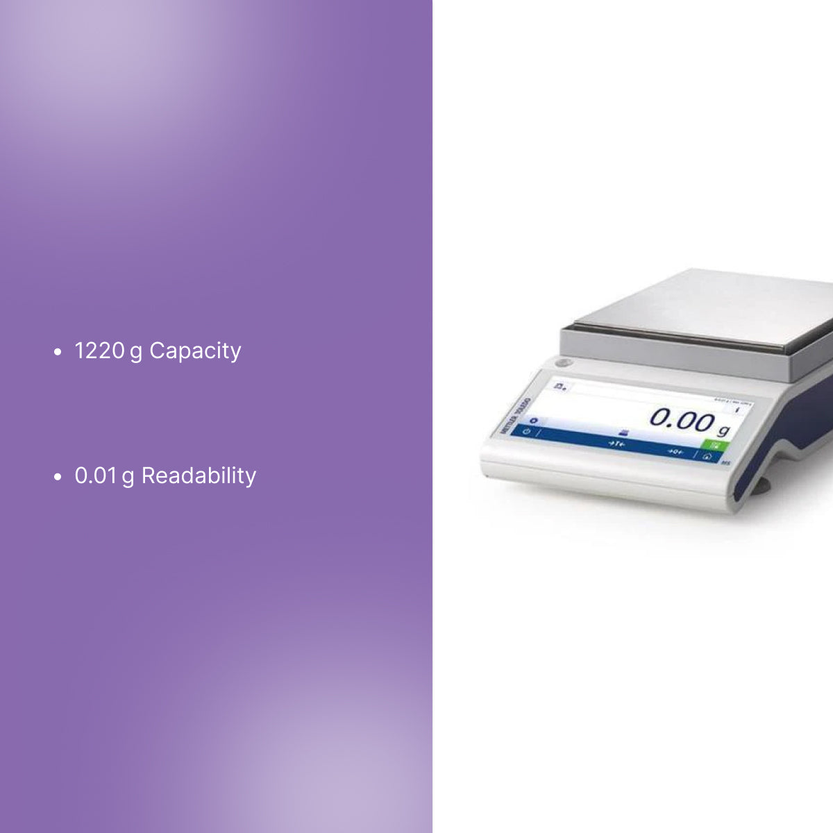• High Capacity and Precision: Offers a maximum capacity of 1220 g and a fine readability of 0.01 g, making it ideal for detailed weighing tasks.