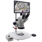 This system features Avens SPZ-50 Stereo Zoom Microscope with 10x eyepieces (6.7x 50x magnification), ideal for examining objects of any size. Includes Avens Ergo Stand with 16" post, 13 x 12.5" base, and a reversible inspection plate.
