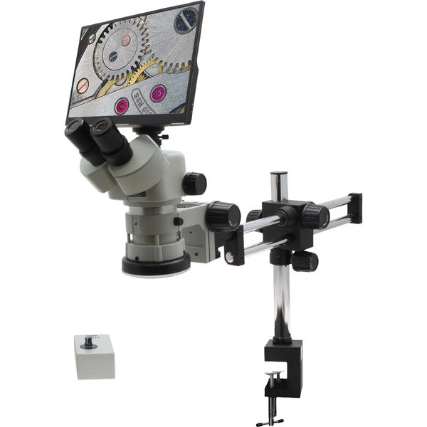 All-in-one stereo zoom microscope system.  The SPZV-50 microscope provides crisp clear 3D images and a wide field of view.  6.7x to 50x continuous zoom with 10x eyepieces.  View objects beneth the microscope through the traditional eyepieces, or on the Mighty Cam Eidos screen.