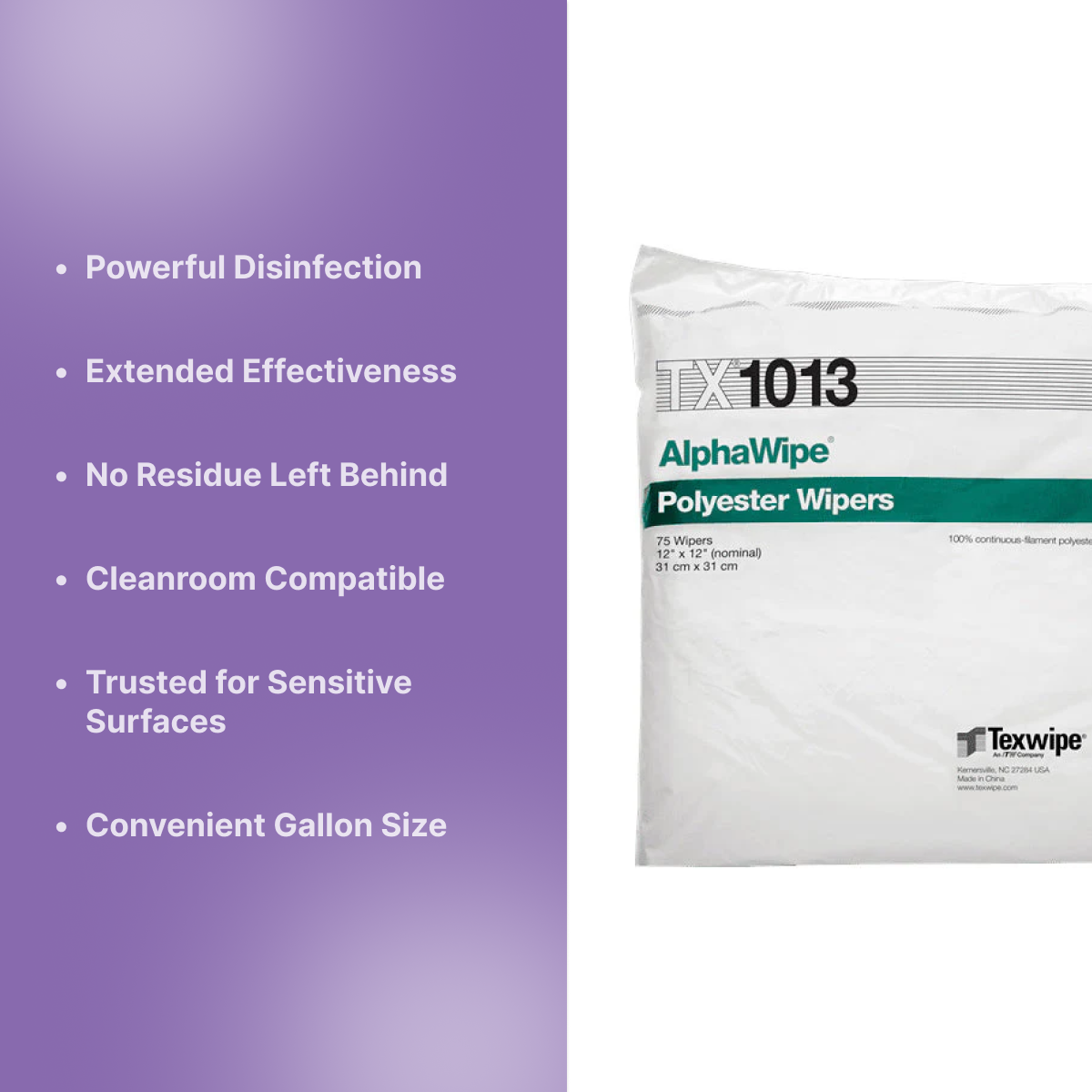 ETexWipe AlphaWipe 12" x 12" Polyester Wipers (TX1013) are designed for critical cleaning applications in controlled environments. Made from 100% polyester, these wipers feature a cut edge and are cleanroom manufactured, ensuring ultra-low levels of contamination. They are engineered for high absorbency and low linting, making them ideal for cleaning, spill control, and solution application in sensitive environments.