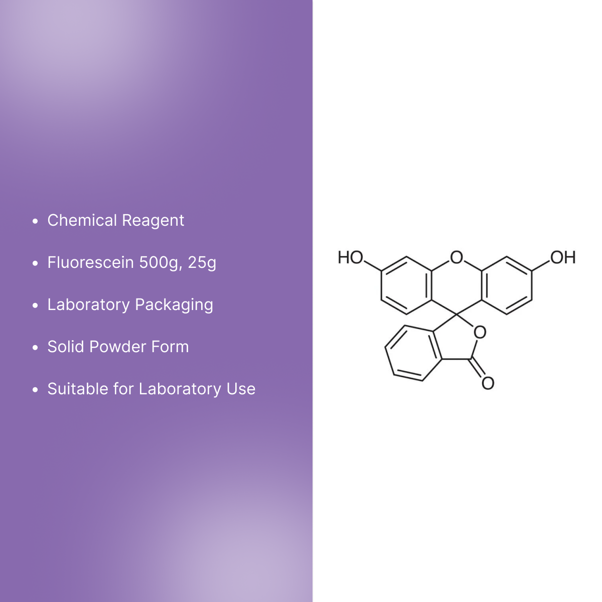 Fluorescein is supplied as a laboratory chemical reagent in a 500g, 25g package. This product provides a consistent and reliable source of fluorescein for laboratory workflows that require this compound in controlled environments.