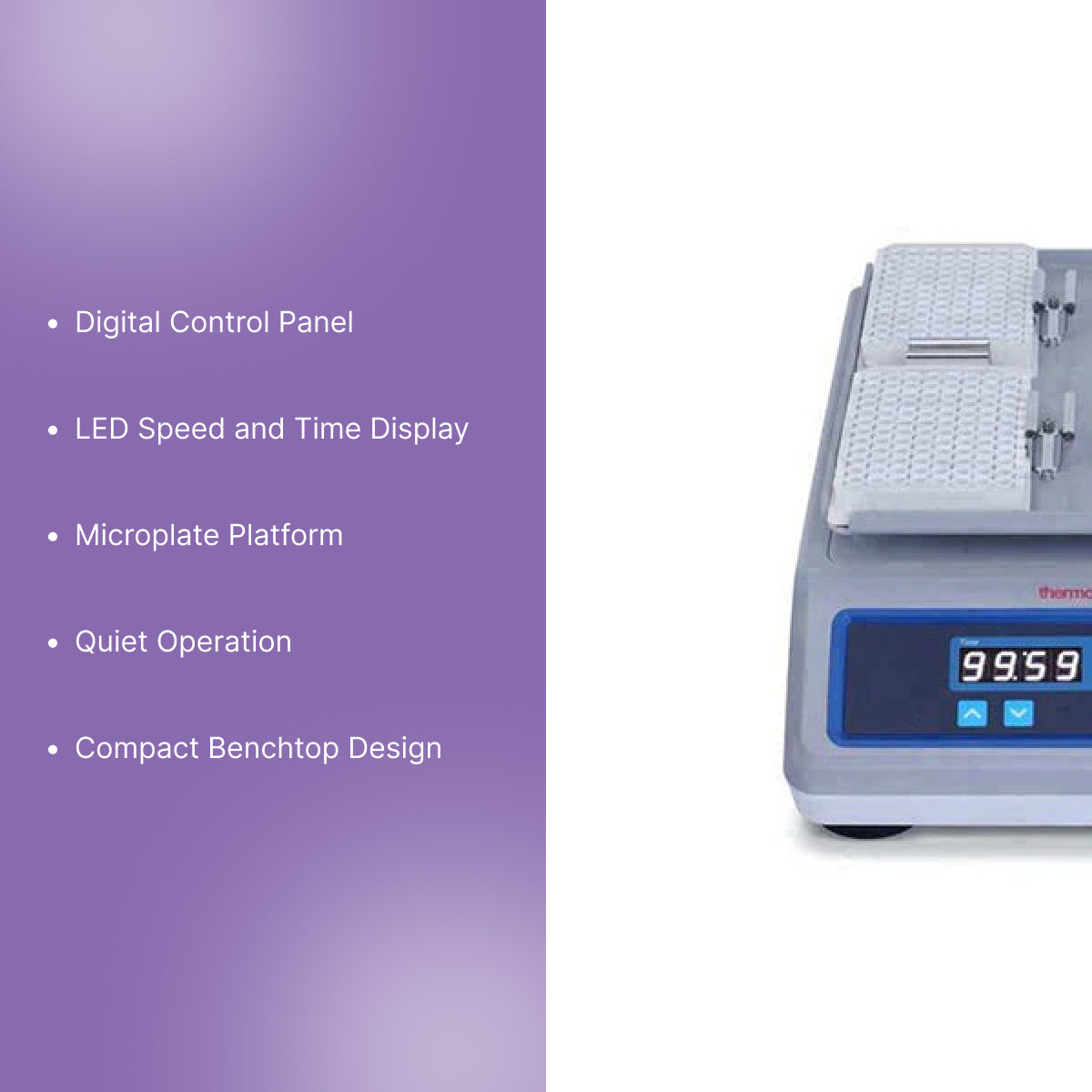 The Thermo Scientific Digital Microplate Shaker is engineered for precise and uniform shaking of microplates in laboratory environments. Featuring digital speed and time control, this lab equipment delivers consistent mixing results for a wide variety of applications, including ELISA assays, immunoassays, protein studies, and cell culture preparation. The compact design makes it ideal for benchtop use in research laboratories, biotechnology facilities, academic labs, and clinical environments.