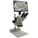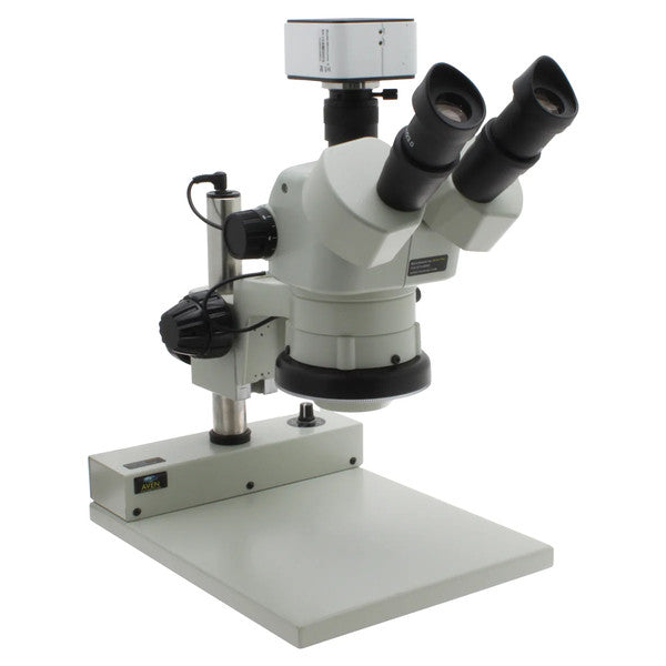 Avens DSZV-44 Stereo Zoom Trinocular Microscope 10x to 44x mounted on stand PLED featuring 60 energy saving eco friendly LED lights with dimmer. A dual view trinocular port allows viewing of the object through the eyepieces and external monitor at the same time. Mighty Cam USB 3.0 6M CMOS Camera With Software allows view to easily capture images onto to your PC for documentation, sharing or measurement.