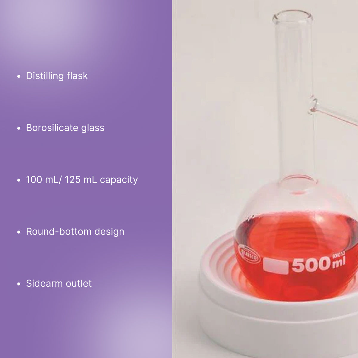 Material & construction: The distilling flask is manufactured from borosilicate glass and features a round-bottom body with an integrated sidearm for vapor transfer.