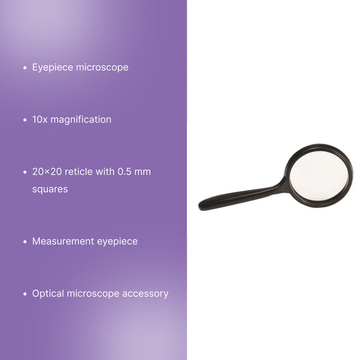 Material & construction: The hand lens features a large 100 mm/ 75 mm diameter lens set in a lightweight plastic frame designed for easy handling and durability.