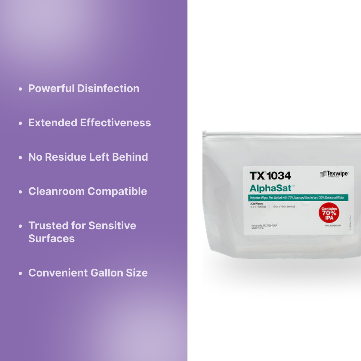 Pre-wetted with 0.2 µm filtered USP-grade 70% isopropyl alcohol (IPA) and 30% deionized water (DIW), these TexWipe AlphaSat wipers provide consistent wetness and optimized VOC levels for repeatable cleaning performance. They are packaged in reclosable slider bags to minimize evaporation, ensuring each wiper remains ready to use.