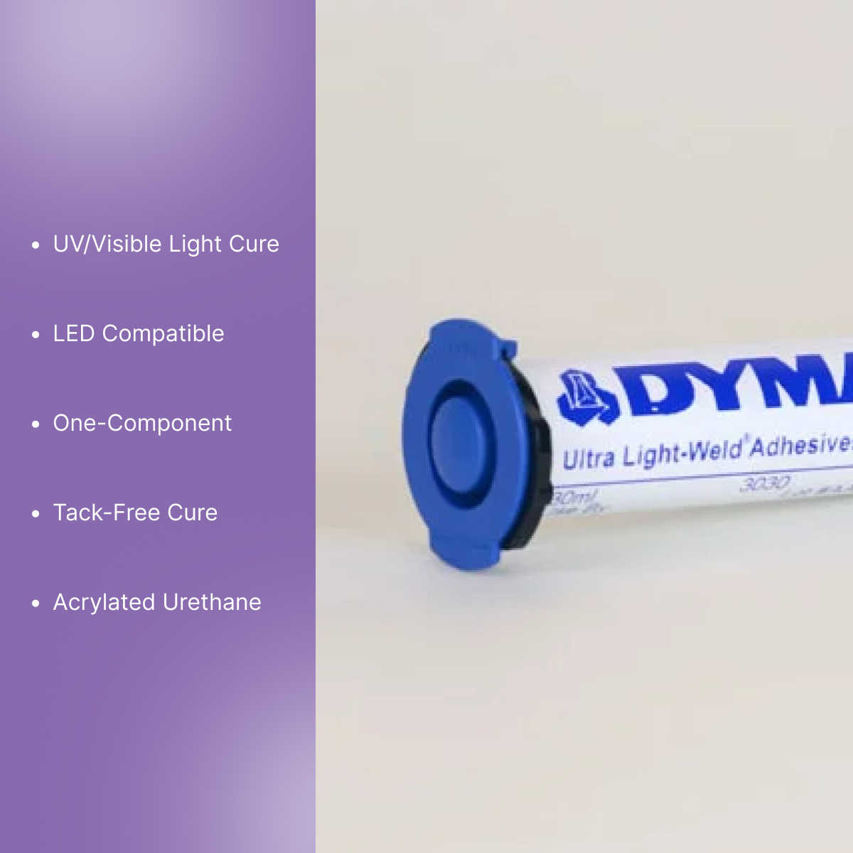 Dymax Ultra Light-Weld 3030 is a clear, one-component UV/visible-light-curing adhesive supplied in a 30 mL MR syringe. The adhesive cures with UV or visible light, including LED sources, and produces a tack-free surface after curing. The material is an acrylated urethane formulation with no non-reactive solvents. It is used for bonding applications such as plastic housings, display assembly, and appliance components. The product listing notes that it is non-cancelable, non-returnable, and typically ships in 21–30 business days.