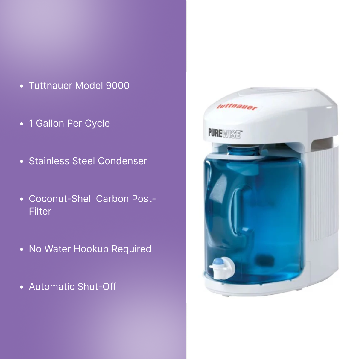 The Heidolph Tuttnauer 9000 Water Distiller produces distilled water by heating tap water to 212°F, eliminating bacteria, cysts, and viruses while leaving behind salts, heavy metals, and other impurities. The steam is condensed in a stainless-steel condenser, and the distilled water passes through a coconut-shell carbon filter to reduce volatile organic compounds. The purified water is collected in a storage container. The removable boiler allows manual filling, and no water hookup is required. The unit automatically shuts off after a one-gallon cycle.