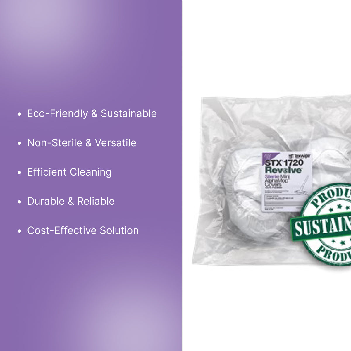 The Texwipe Revolve Mini Alpha Mop Cover (TX1720) is part of the sustainable Revolve™ line, made from 100% upcycled polyester to reduce landfill waste. Designed for cleanroom environments, these mop covers meet strict cleanliness standards while supporting environmental sustainability. Suitable for high-traffic cleanroom zones in semiconductor, biotechnology, and medical device manufacturing, the Revolve mop covers efficiently clean large and small surfaces with superior particle-trapping capabilities. They can be used with or without frames for flexible cleaning performance.