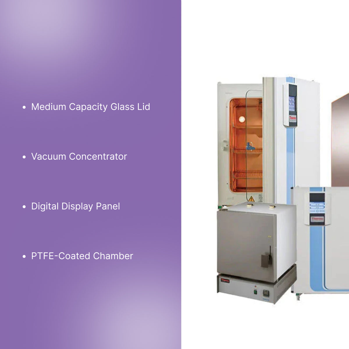 The Thermo Scientific Savant Vacuum Concentrator with a medium capacity glass lid is designed for efficient and rapid concentration of aqueous and organic samples. This lab equipment is ideal for applications such as drying DNA/RNA, PCR samples, proteins, enzymes, and HPLC fractions. The concentrator features a medium-capacity glass lid that enhances evaporation efficiency by providing controlled heating to accelerate sample concentration.