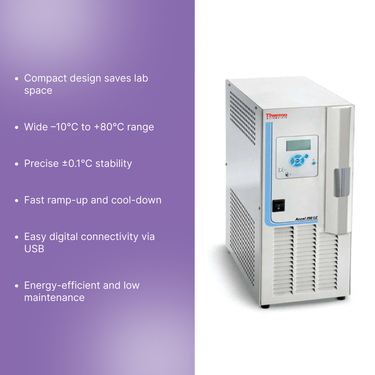 The Thermo Scientific Polar Series Accel 250 LC Recirculating Chiller provides 250 watts of efficient cooling power in a compact, lab-friendly design. With a wide temperature range of –10°C to +80°C and rapid ramp-up and cool-down performance, it’s ideal for precise and dynamic thermal control.